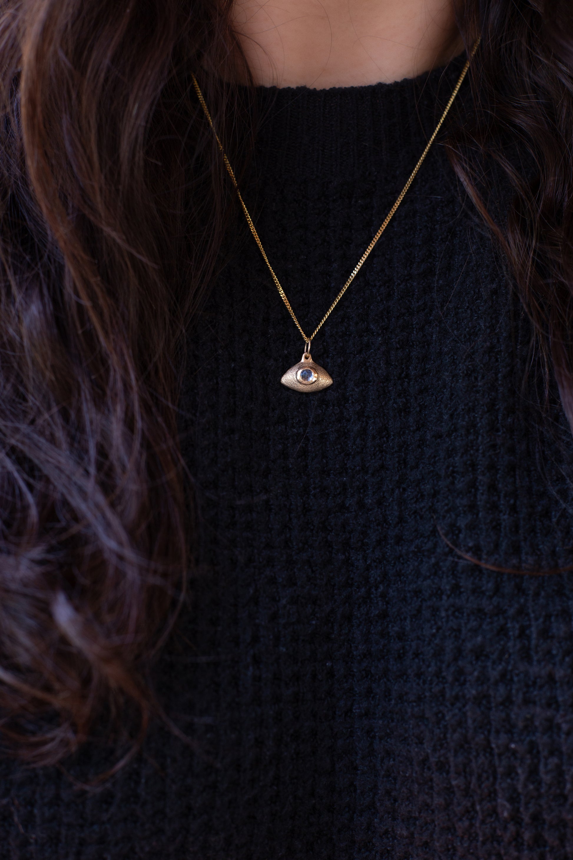 Hand carved in wax and sand cast in 14k solid yellow gold. This Evil Eye charm features a beautiful 4mm rose cut Montana sapphire cabochon that gleams like water under the moonlight.